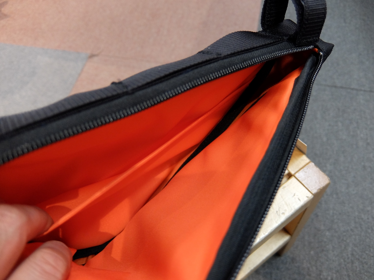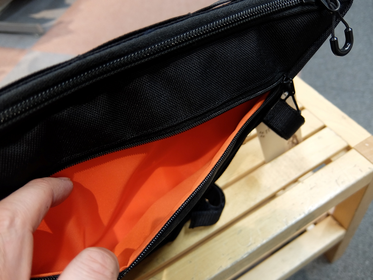 バッグに入れた内容物を見やすくするために、裏地は視認性の高いオレンジ色にしてあります。