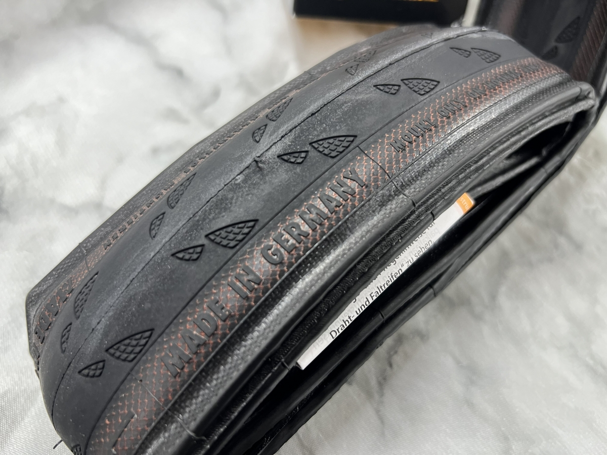 ロングライドやツーリングなど長距離ライド、路面状況の悪いところやパンクリスクの回避など、耐久性を軸にしたタイヤ選びの王道だと思っているこのタイヤ。今でこそほどほど太いタイヤが標準装着できるロードバイクが当たり前なので、溝のあるツーリングタイヤやアーバンタイヤなどの選択肢もありますが、まだまだ細いタイヤが主流だった頃はこのタイヤが神のような存在でした。採用するコンパウンドはシリカコンパウンドで上位モデルとは異なるものの、充分なグリップと耐久性を誇ります。