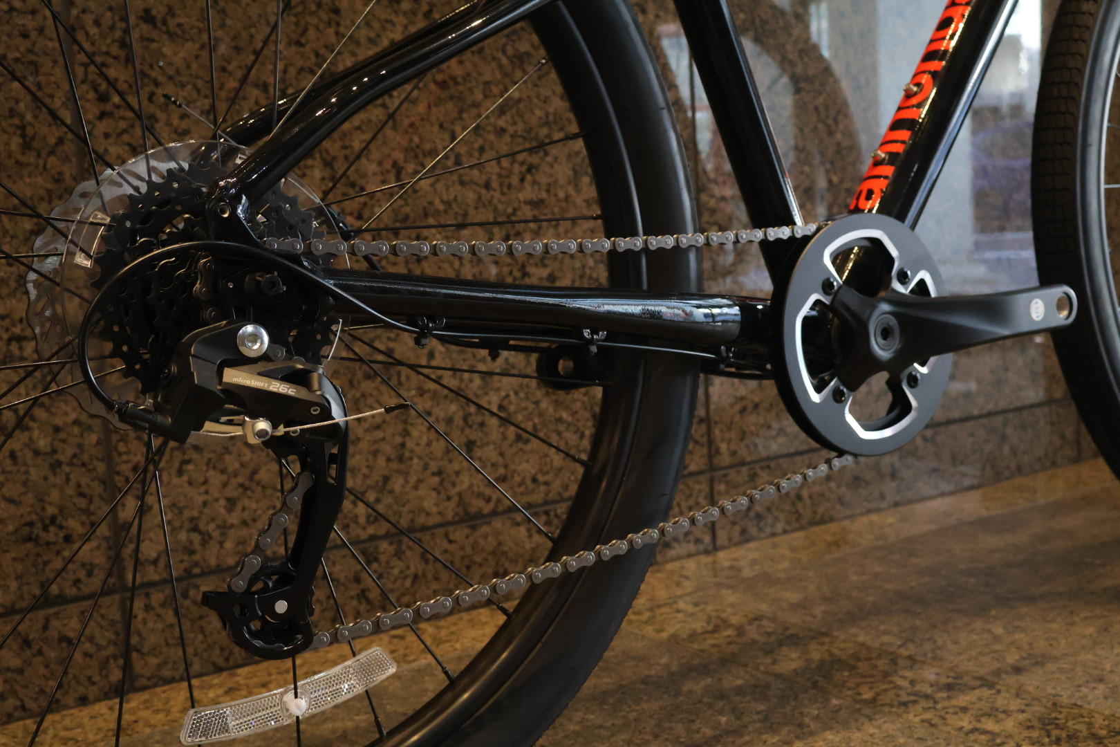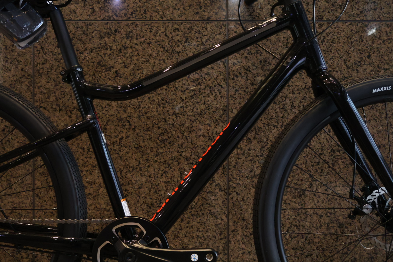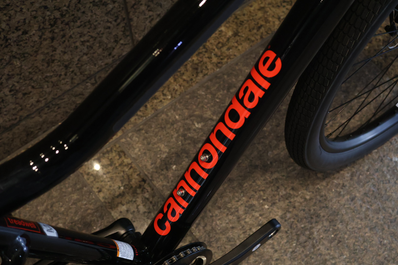 車体側面からうっすら見えるオレンジカラー、真上から見るとCANNONDALEの文字がダウンチューブに入っています。全体の艶がある黒フレームにインパクトのあるオレンジ文字がカッコイイです!