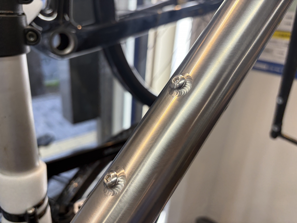 ダボ穴も豊富でドリンクボトルや輪行バッグ、対応しているトップチューブバッグであればねじ止めもできるようになっています。