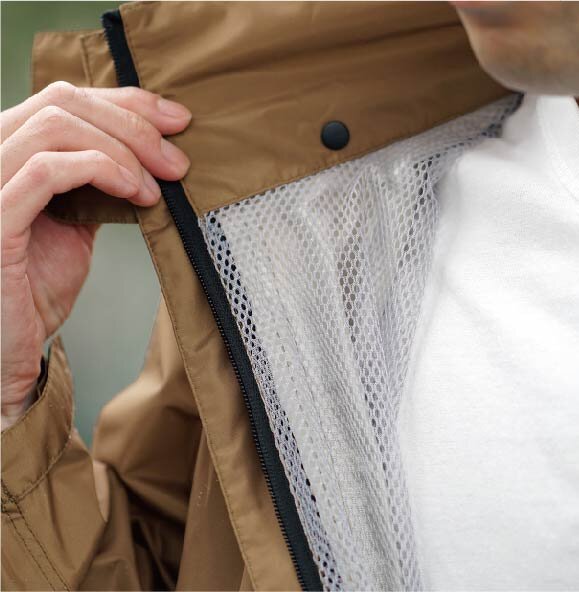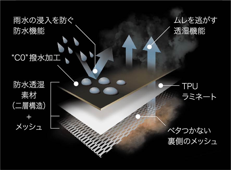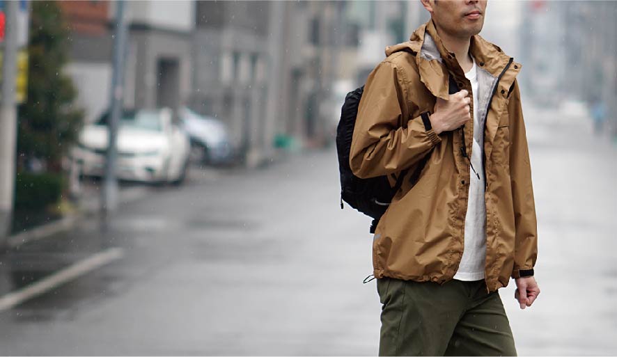 生地は耐水圧10000mm透湿度5000g/㎡・24hの防水透湿素材を使用。本格的なレインウェアやスキーウェアなどと同じぐらいのスコアですのでレインウェアの役割は申し分なしです!