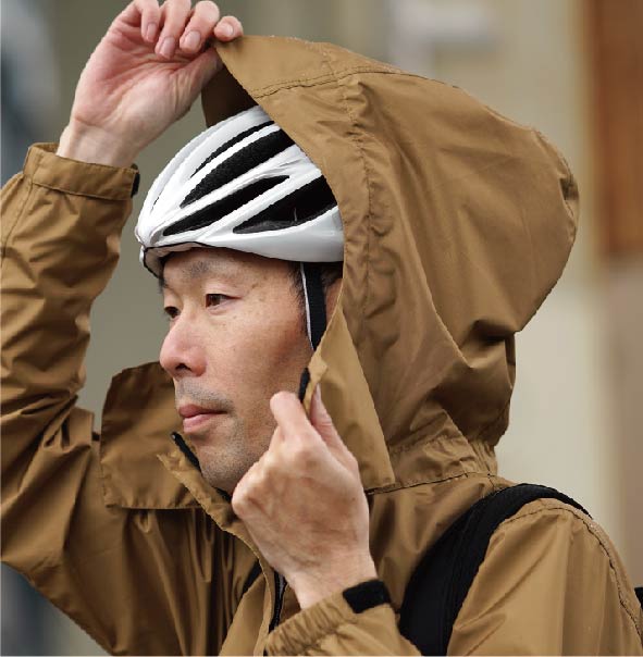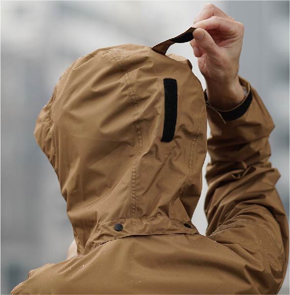 少し大きめのフード設計でヘルメットを被った上からでもフードを着用することが可能です!これのおかげでヘルメットや頭を濡らさずに走行することがで来ます。またフード後ろのベルトでフィット感を調整でき、フード内側にヘルメットホルダーがついてますので風でフードがめくれることを防いでくれます!更に後方確認をする際後ろを振り返るとフードも一緒についてきてくれます!地味にうれしい機能ですね。