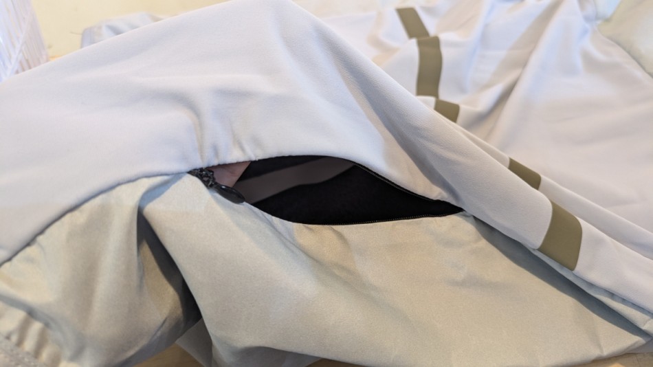 右側の側面にはファスナーが付いており、ここからジャージのポケットにアクセスすることが出来ます。ただ、値段を考えると背中にポケットがあって欲しい気もしますね、、、