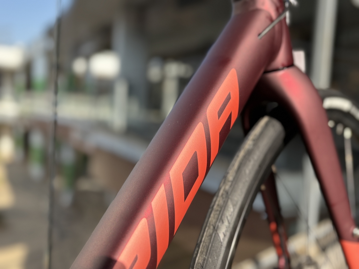 フレームカラーはワインレッドの様なメインカラーにオレンジ色のメーカーロゴをあしらえたお洒落なカラーリングとなっています。