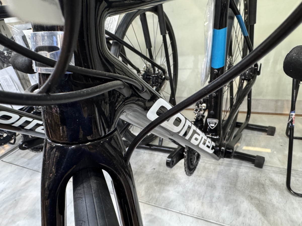 対象のカラーは、クリアブラックにターコイズブルーで差し色が入っているような車体で、トップチューブの上部はマットブラックになっている凝ったカラーリングです。