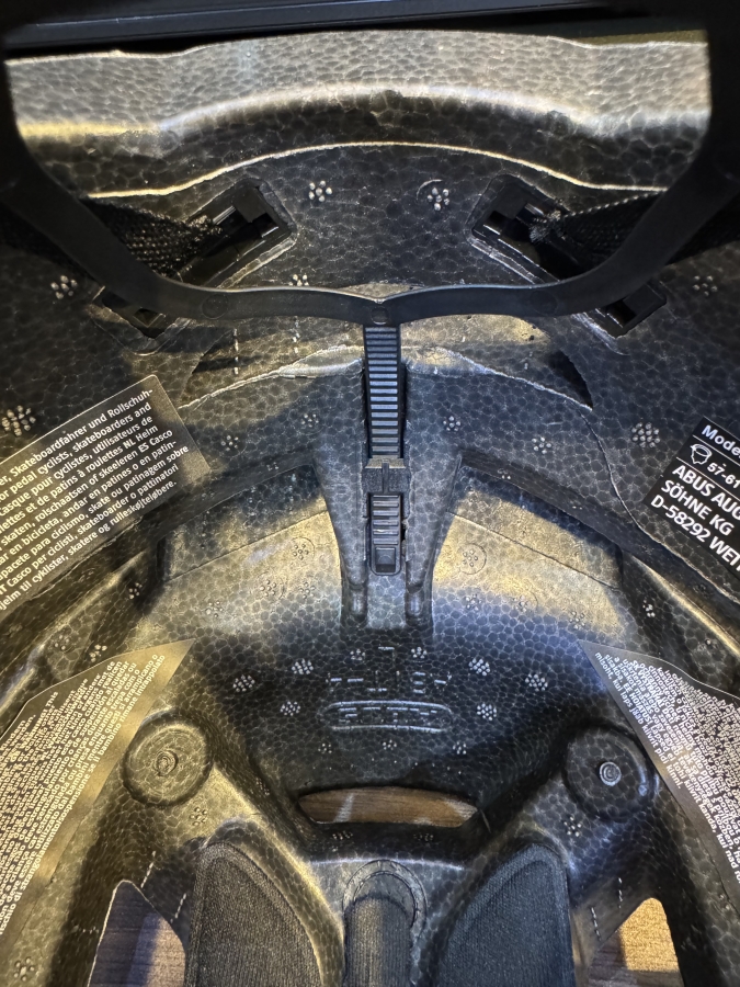 ABUSのヘルメットには、一般的なメーカーよりもシェル部分に隙間ができにくいように、より細かいEPSが多い配合で成形されているそうです。