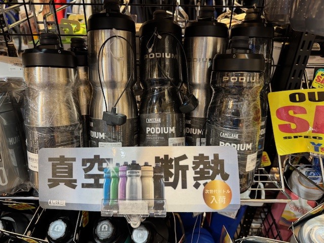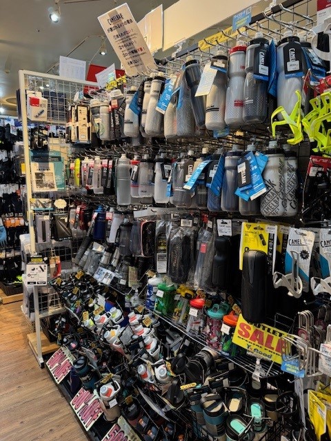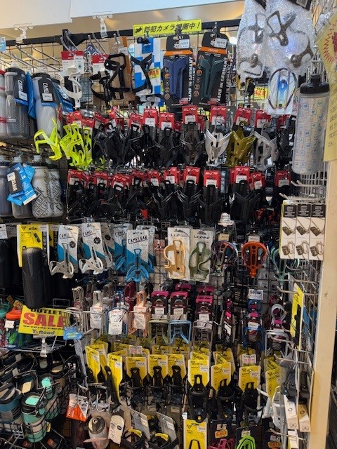 サイクルボトル専用品や、500MLペットボトルで使用できる商品、大きいボトルを括り付けられるケージなど、いろいろありますので、迷いましたらスタッフにお聞きください!