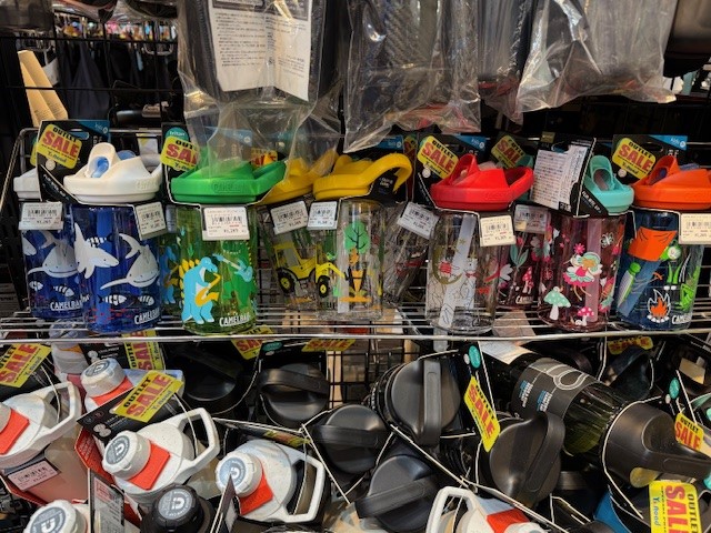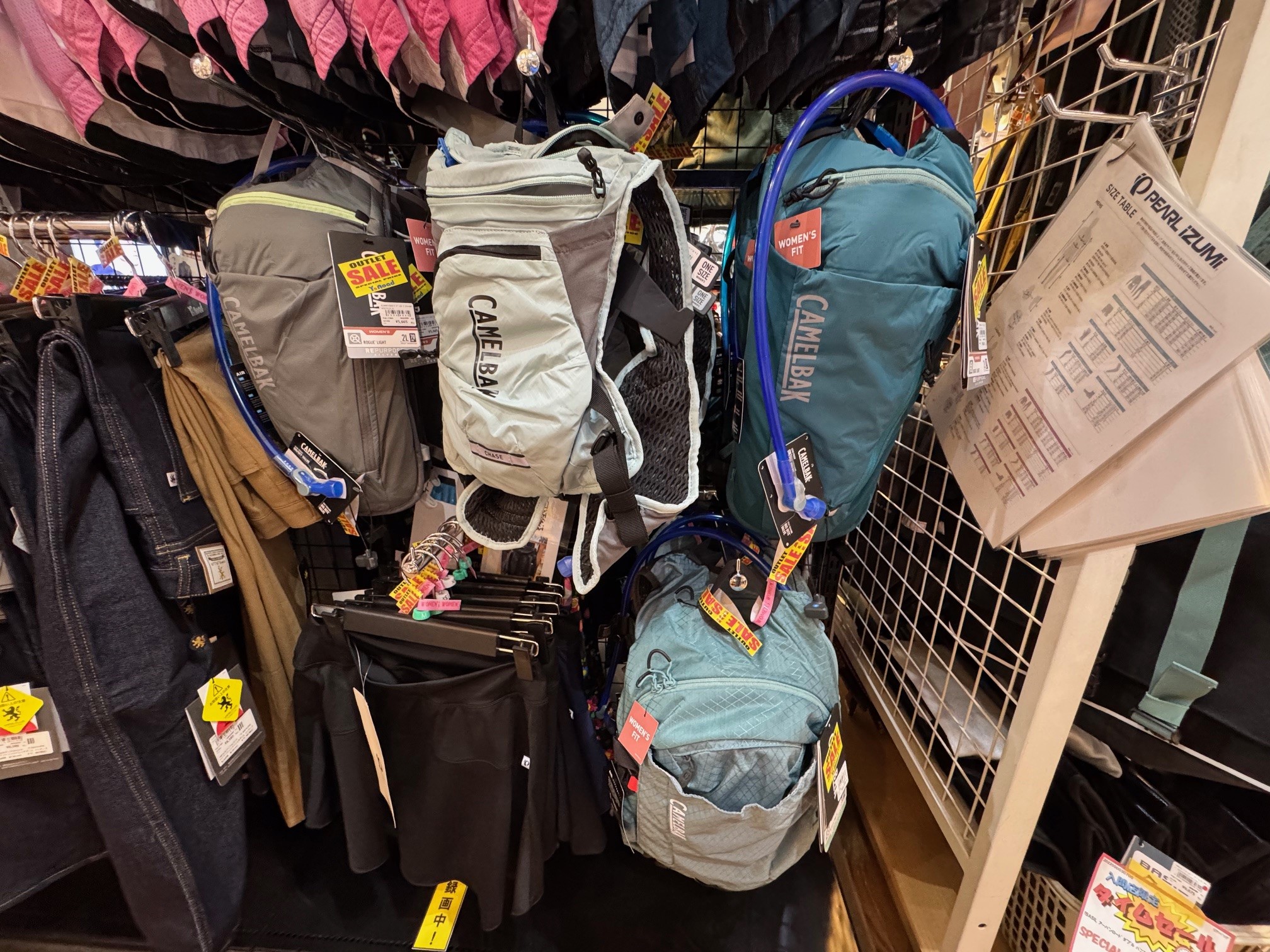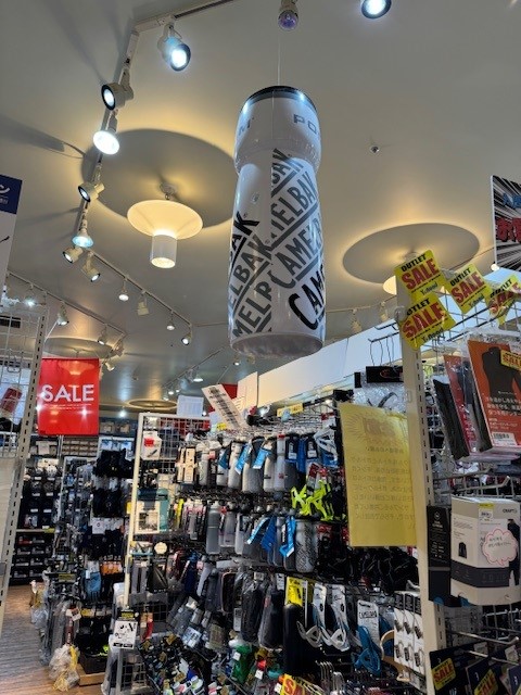 店舗内の空中に浮かんでいる巨大なキャメルバックボトルの模型の下に、商品があります!目印としてこちらを探しましょう!