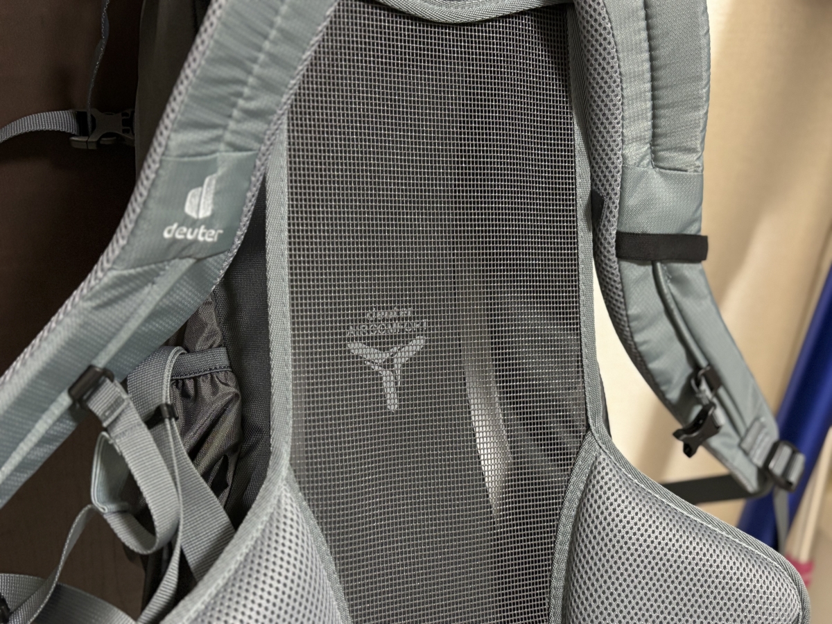 背面のメッシュ状の板が背中とリュックとの空間を空けてくれるので通気性にめちゃくちゃ優れています。