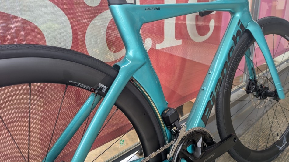 フレームは全体的にエアロロードらしくインパクトのある見た目になっています。UCIの規制緩和によってヘッドチューブの厚さを厚くすることが出来たり、トップチューブの造形も自由度が増しました!OLTREではヘッドチューブ付近は分厚く中心に向かって細くなり、シートポストに向かって太くなるといった形状になっています。