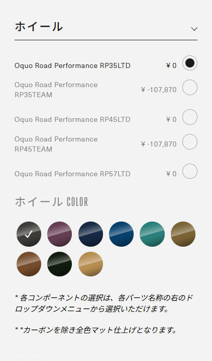 このように同じグレードであれば金額が変わらずにリムハイトの選択が可能です。OMXのグレードではZIPPの最上級コグニッションハブを採用した最上級ホイールが付属してきます。OMRのグレードではワングレード下のチームホイールが付属します。ただ、TEAMグレードもZIPPの303ファイアクレストに採用されているものと同じハブなので性能は申し分ないです!