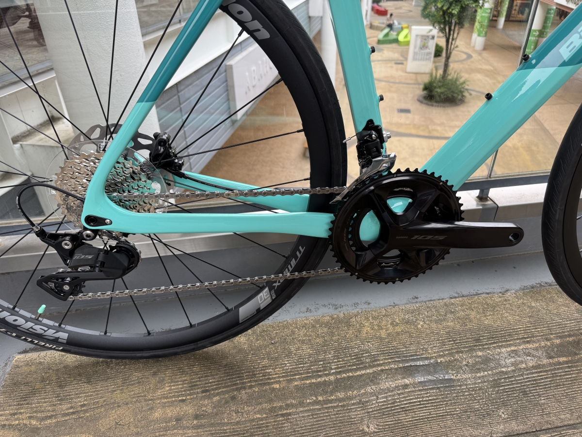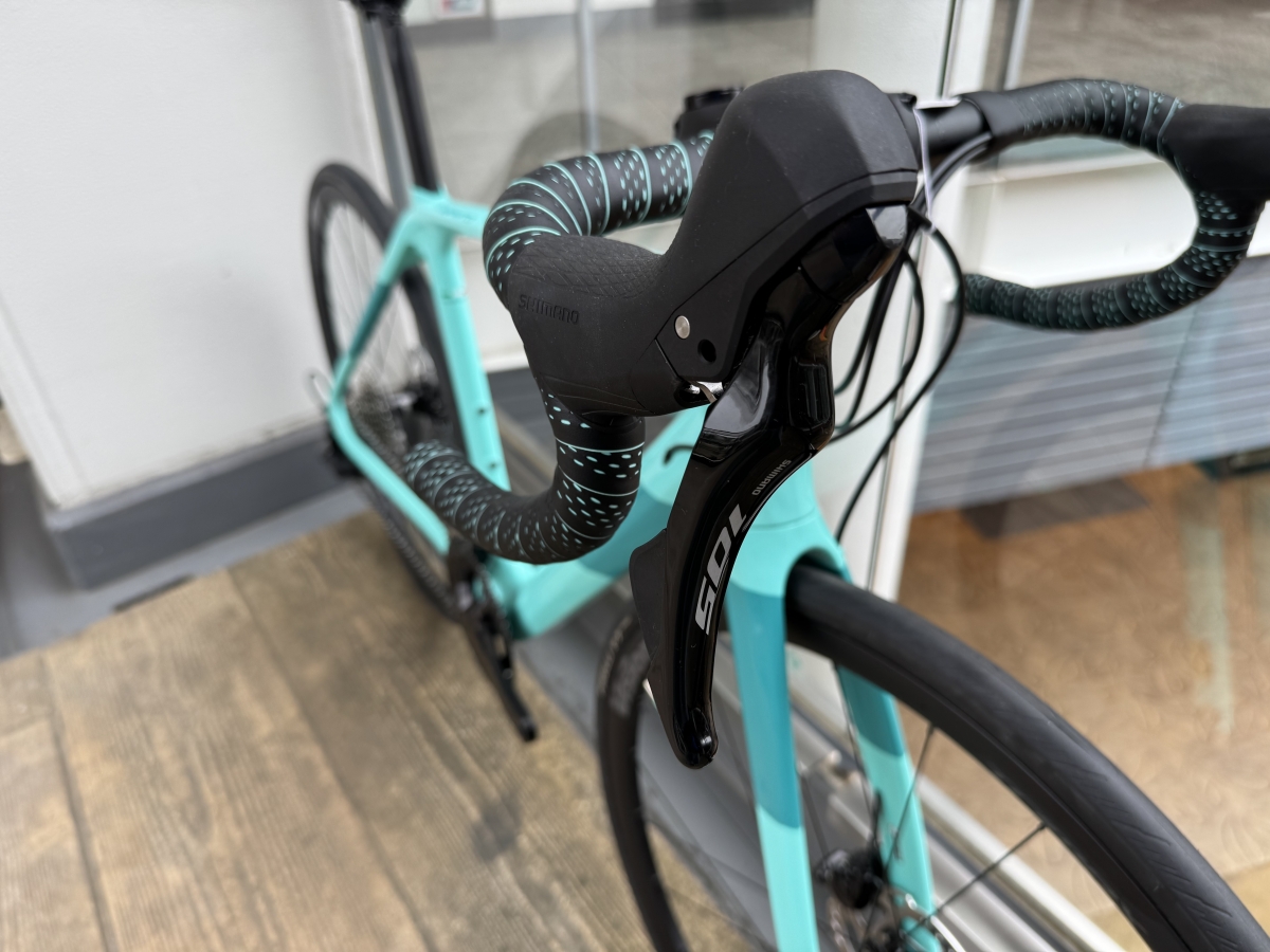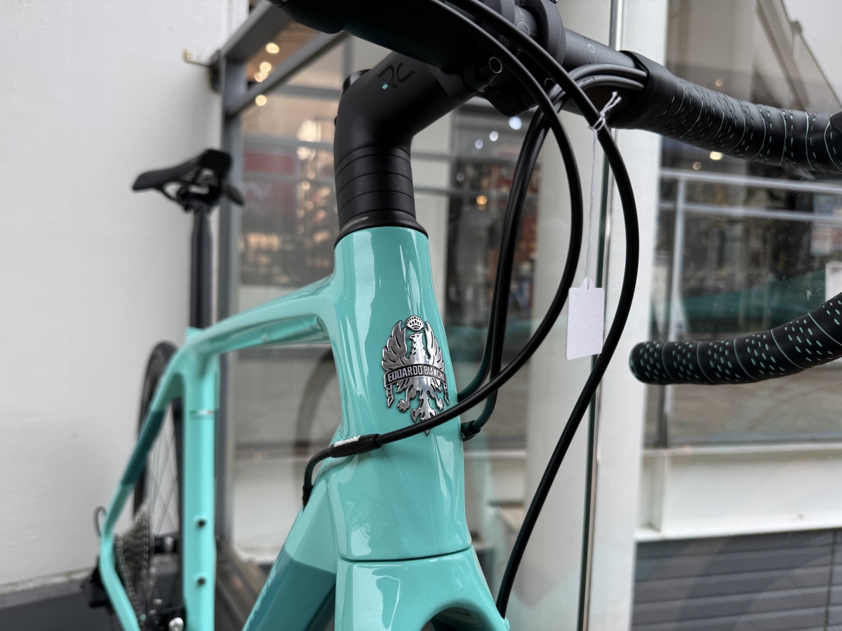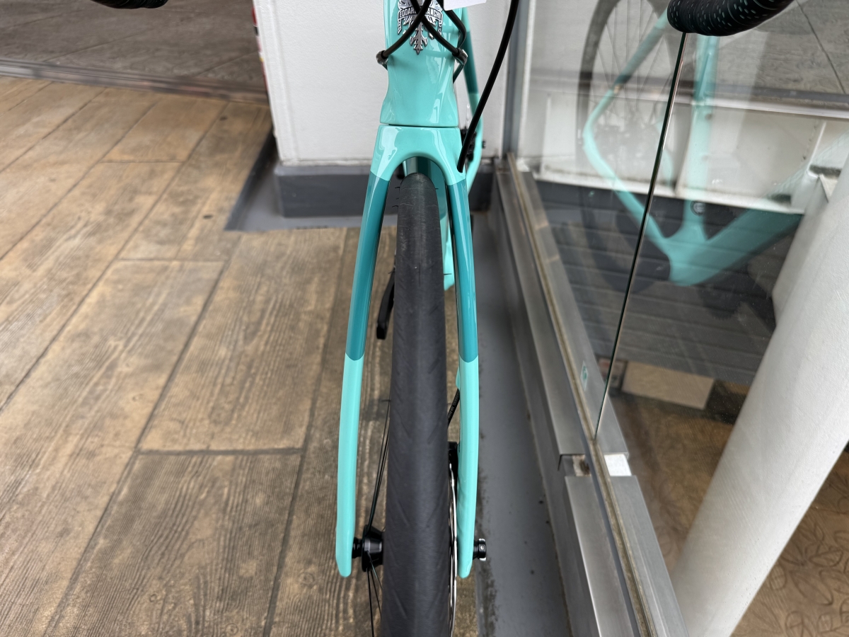 BIANCHIらしいチェレステのフレームカラーにターコイズのメーカーロゴが綺麗なカラーですね。