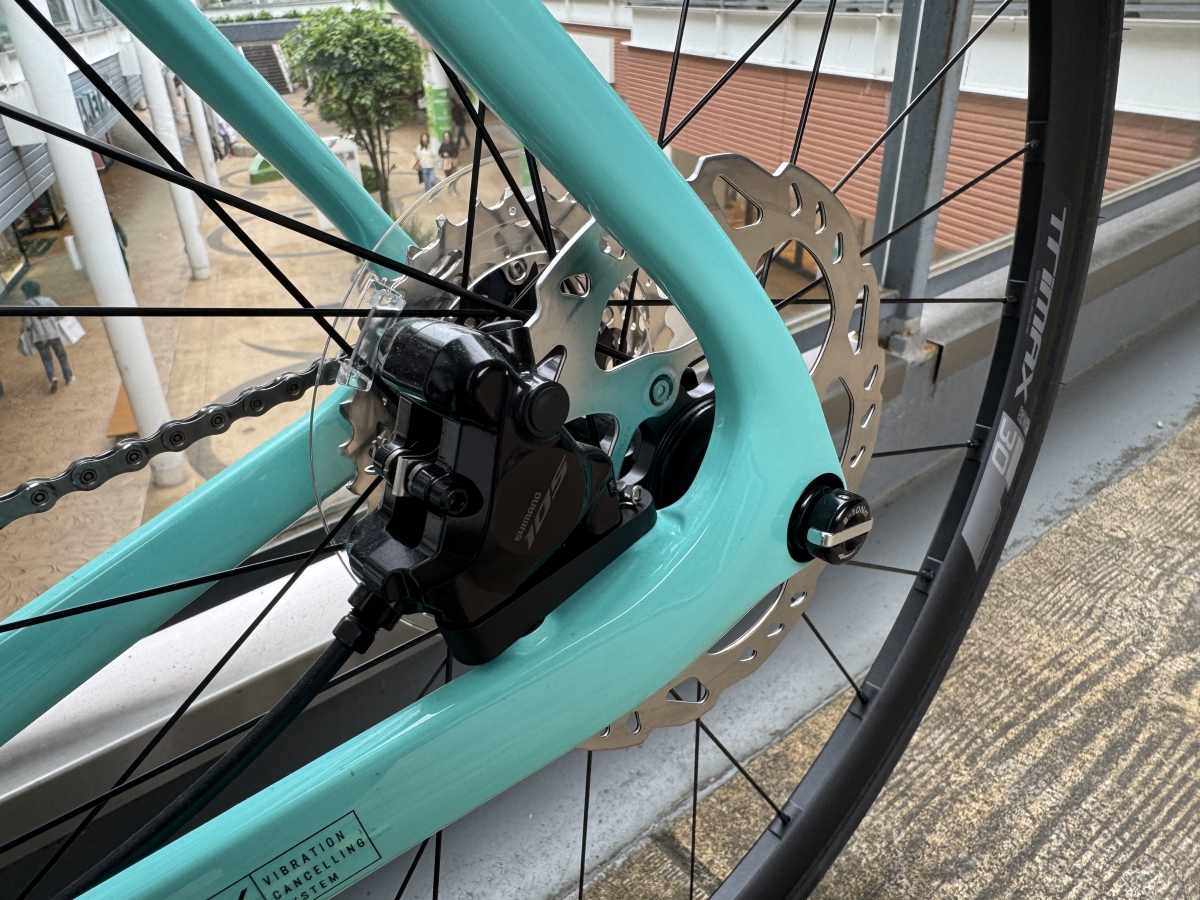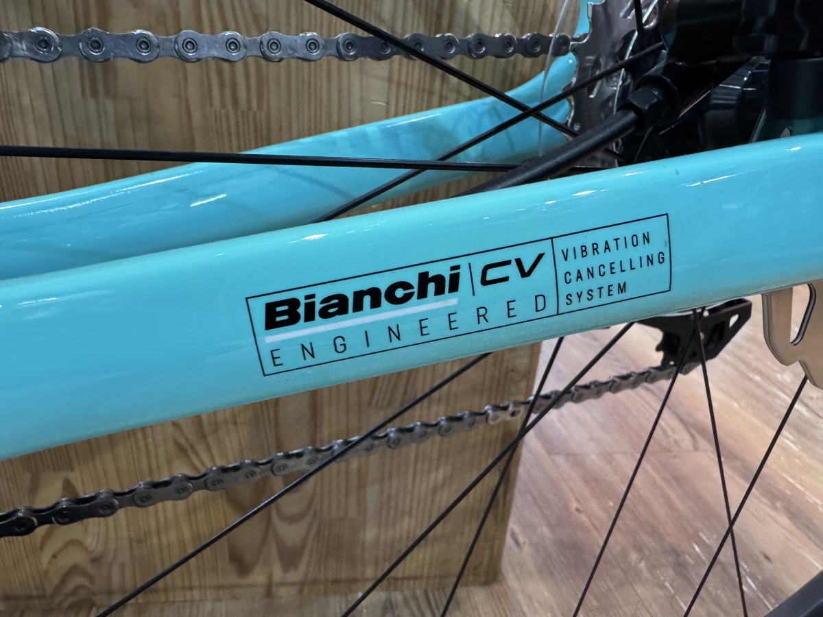 CVはBIANCHIの特許素材で、特殊構造のカーボンコンポジット素材をフレームに採用することで、路面の振動を最大で80%除去してくれる画期的な素材となっています。