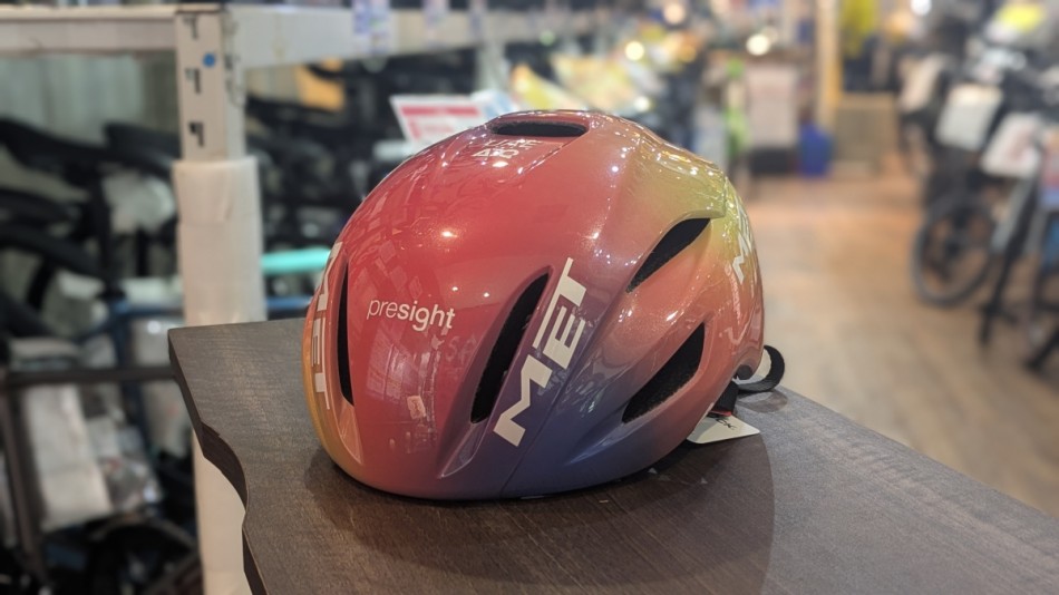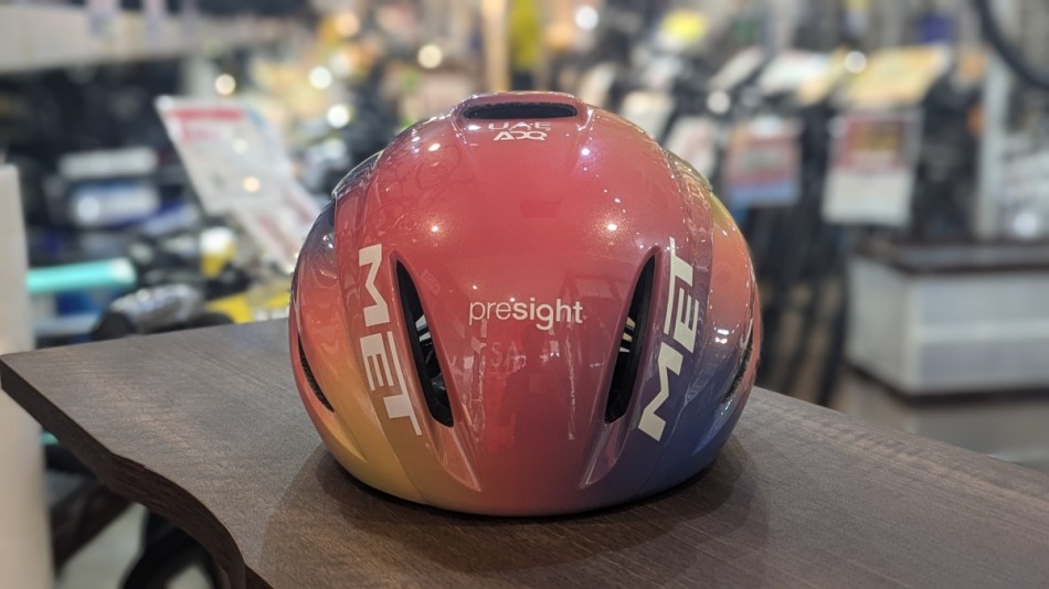 METのハイエンドエアロヘルメットのMANTAです。このカラーを見ただけで分かる方もいると思いますが、UAE team ADQという女子チームのカラーとなっています!黄色から青色にグラデーションがかかっていてとてもきれいな色が特徴です!