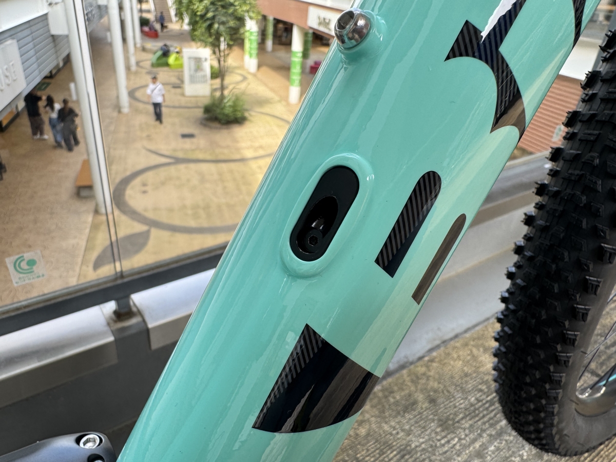 この車体はフロントシングルですが、フロントダブルにする際に横引きタイプのFDを選択した場合は、フレームにワイヤールーティング用の穴が開いていますよ。