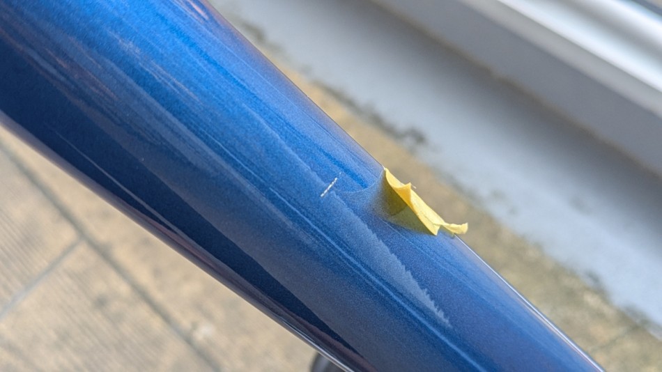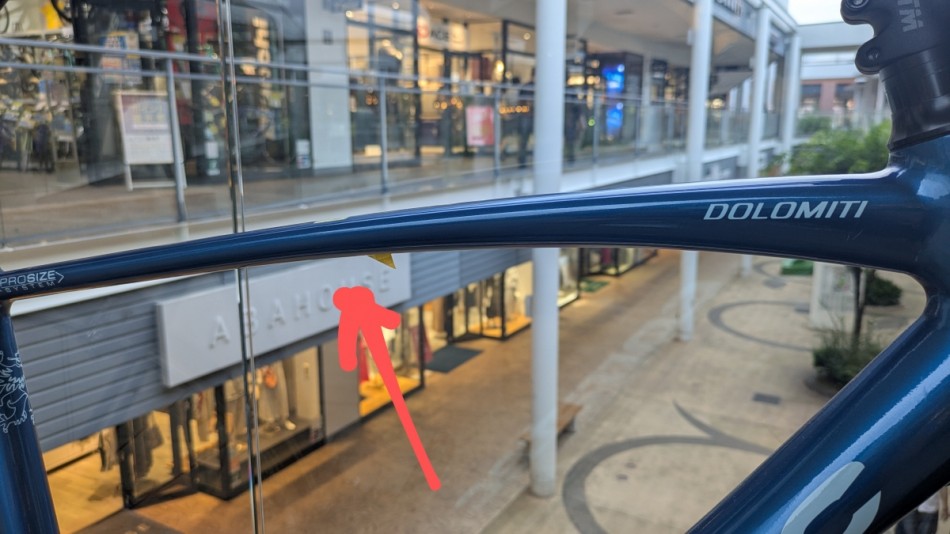 傷についてはトップチューブ裏の矢印で示したあたりの位置にあります。トップチューブ裏なのでかなり目立ちにくい箇所ですがご購入の際にはアウトレット車として傷に関してはご了承いただく必要があります。実際にどのような傷か気になる方はスタッフにお声がけください。
