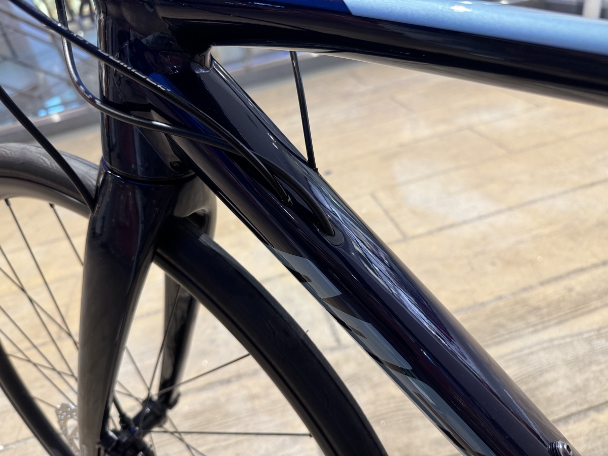 ヘッドチューブを短めにすることで、前傾姿勢がとりやすいジオメトリーを採用し、風を切りながら前進できるような車体です。