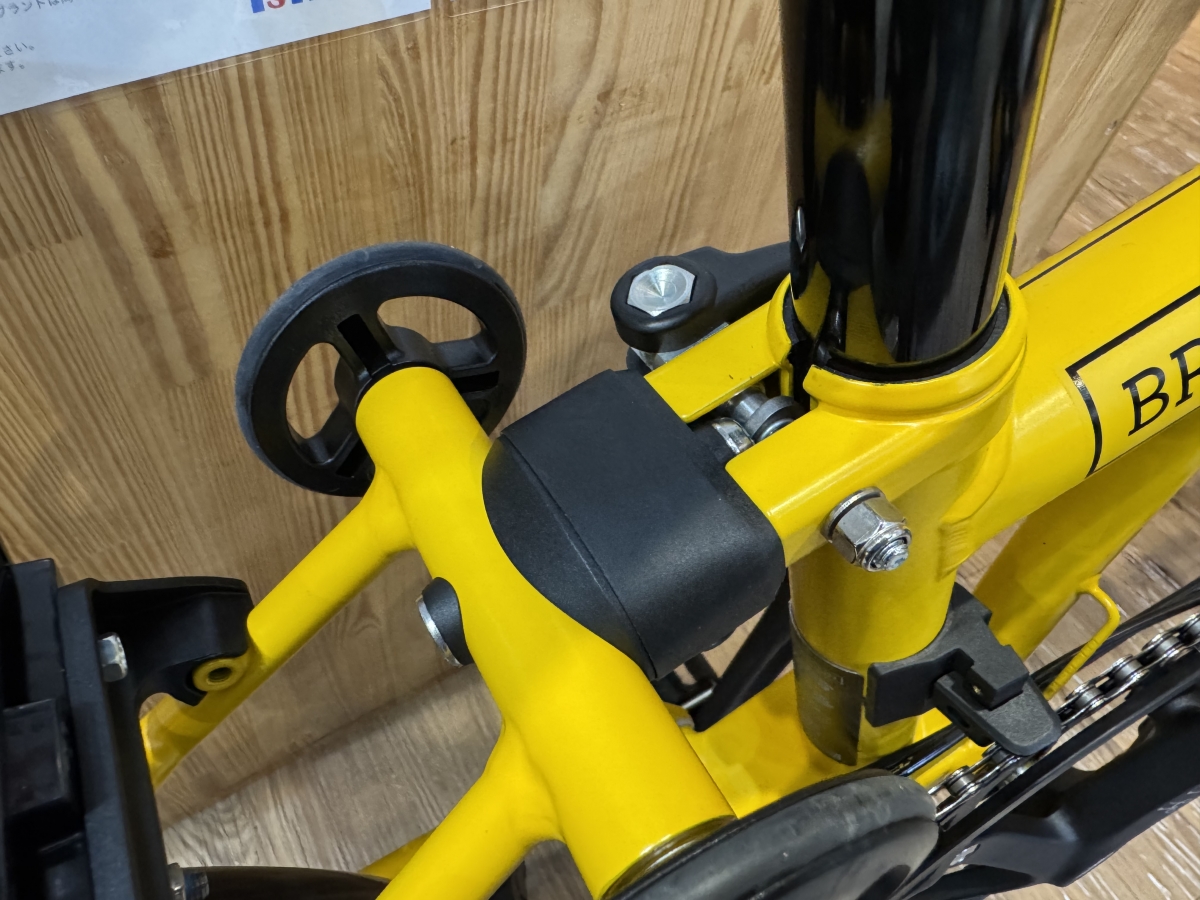 フロントフレームは以前から大きな変化はなく、BROMPTON特有の三つ折りが可能な様に、メインチューブとハンドルポストが折り畳み可能な設計ですね。