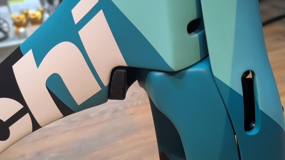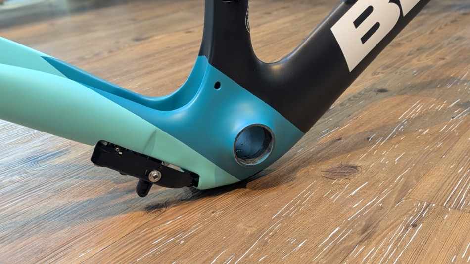 リアのブレーキも空力を抑えるためにBB付近に設けられています。BBもタイムトライアルなどでの高出力に耐えるためにとてもマッシブに作られています!