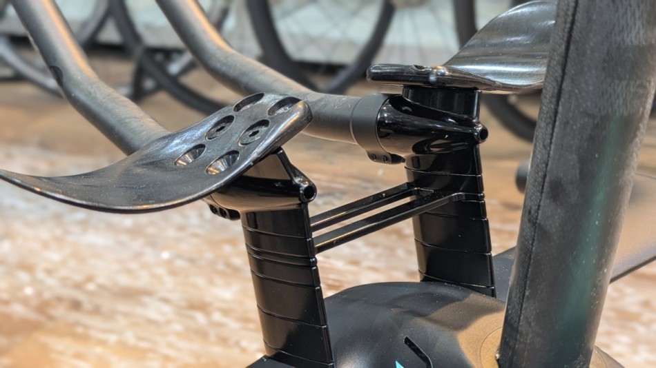 スペーサーは全て積まれた状態でこのぐらいの高さになります。また一番上部のパーツは左右を入れ替えることでアームレストの幅を変更することも可能です!写真の幅だとアームレストは広めになるのでトライアスロンなどリラックスして乗りたい方向け、逆に狭くすることで空気抵抗を抑えたポジションになりTTレースなどに出られる方向けのポジションになります。
