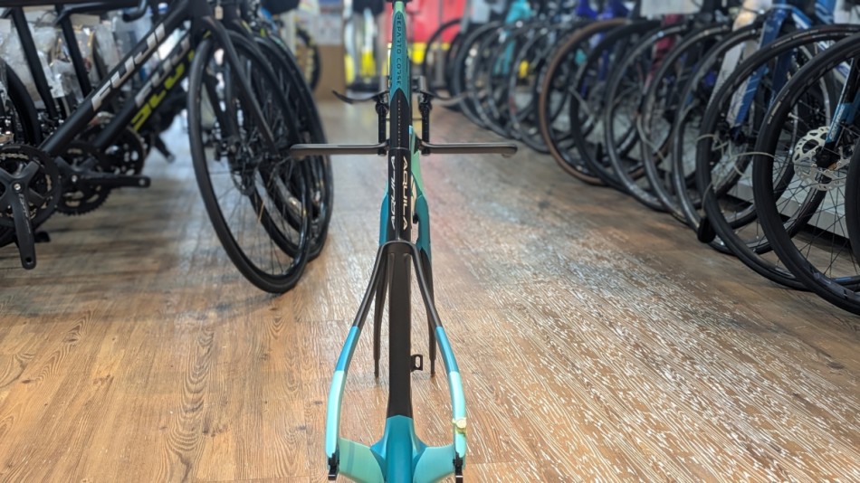 入間店では滅多に入ってこないTTフレームが入荷しました。モデルチェンジ前のリムブレーキタイプのフレームですがメーカーの空力技術を詰めに詰めまくった戦闘力抜群のフレームです!