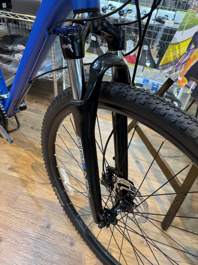 サスペンションはSR SUNTOURのNEXというモデルで、50mmトラベルのロックアウト機能付きのサスになっていますね。