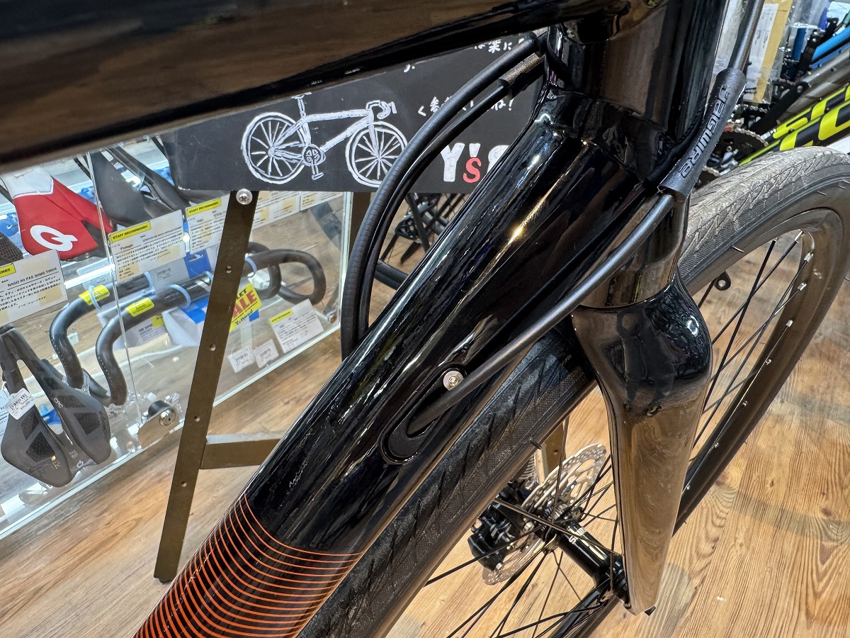 フォークはカーボンフォークで、軽いハンドリングと高い振動吸収性が得られますね。