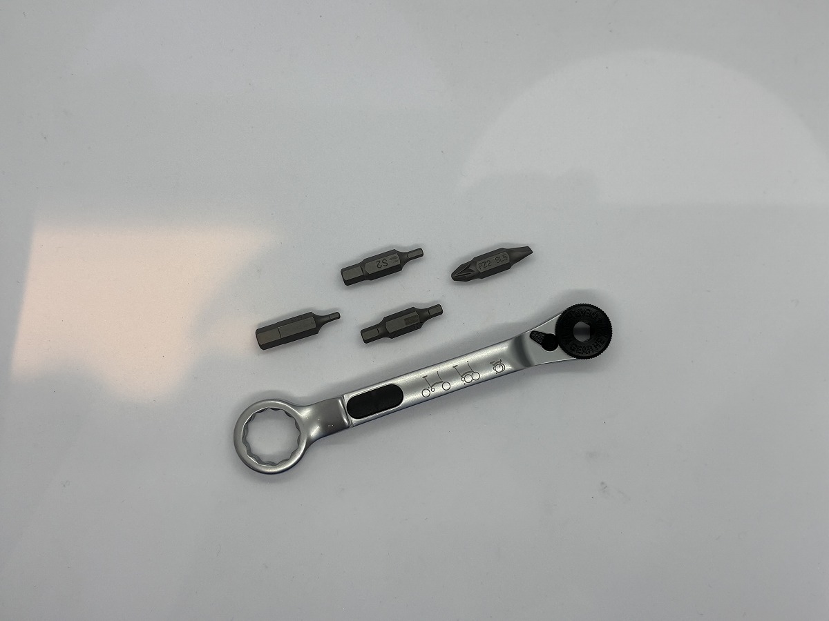 ホイールナットを外す時に使うメガネレンチ。ラチェットハンドルにはブロンプトンの車体が描かれていてお洒落です。