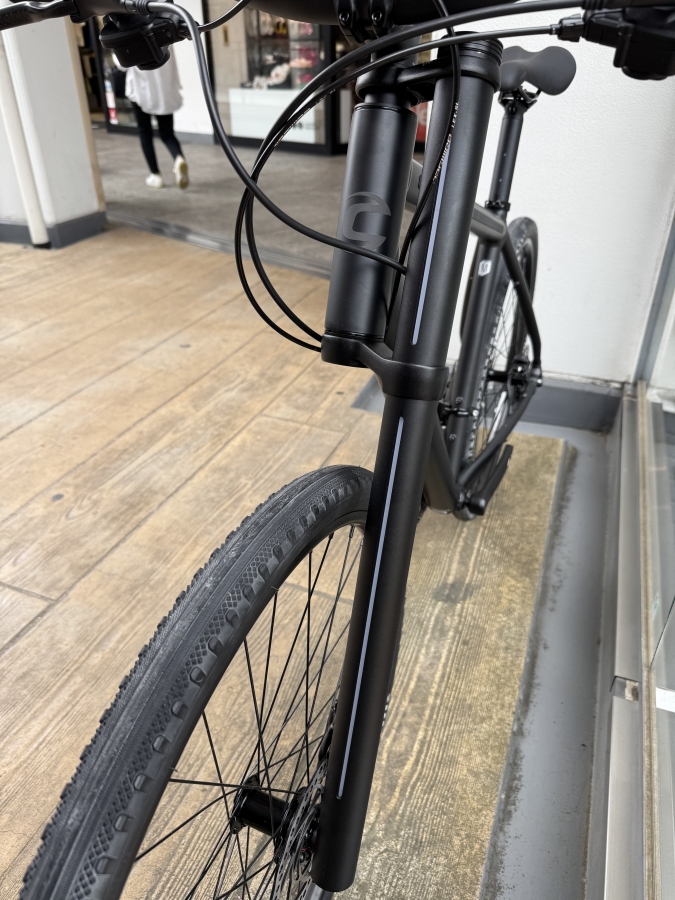 本来、二股になった間にタイヤが来るのに、こんな構造で大丈夫なんですか?っと聞かれますが、Cannondale曰く、一本の棒をヘッドチューブを挟むような形で固定しているので、軽量かつ高強度となっています。
