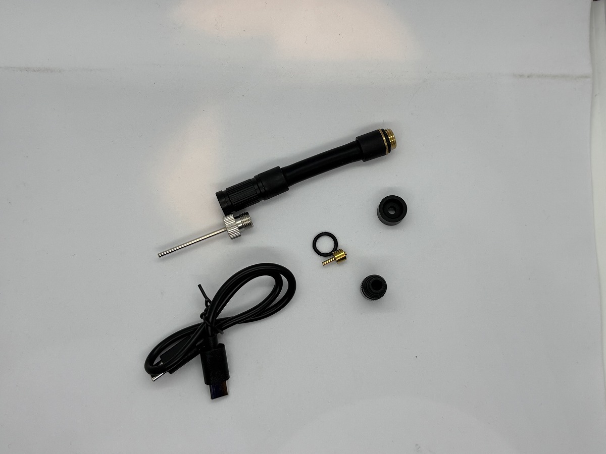 樹脂製バルブに使う延長エアホース、延長ホースに使う仏式アダプター、米式用の口金ピン、予備のゴムパッキン、エアホース用Oリング、ボール用ニードル、充電ケーブル