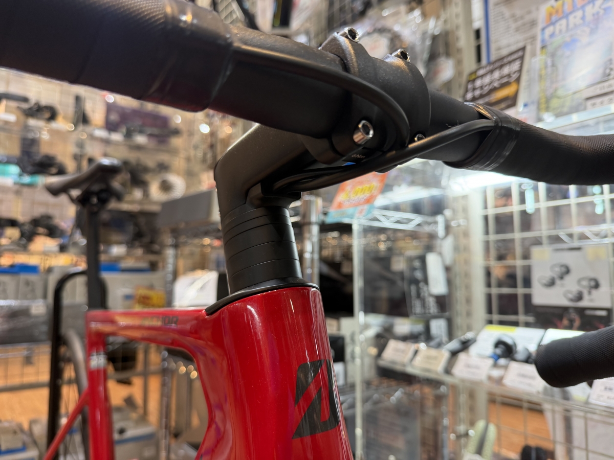 全体的にケーブルなどの張り出しが少なく空力を考えて作られた形状でありながら、ホースはステム下内装なのでハンドルの自由度は高いですね。