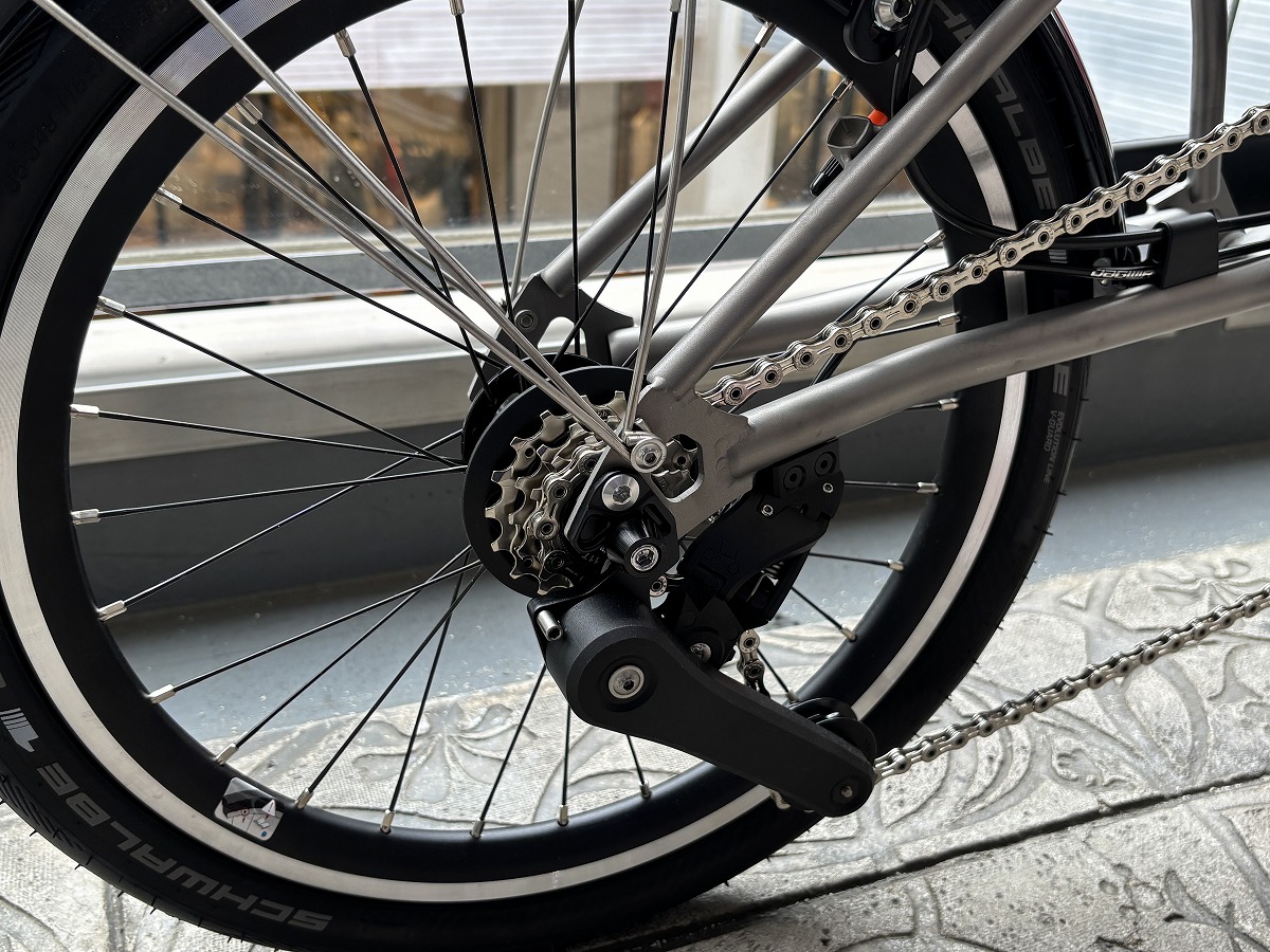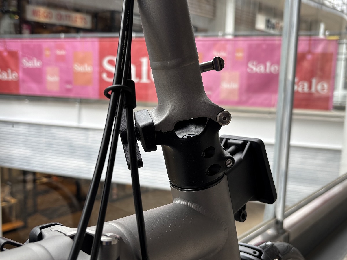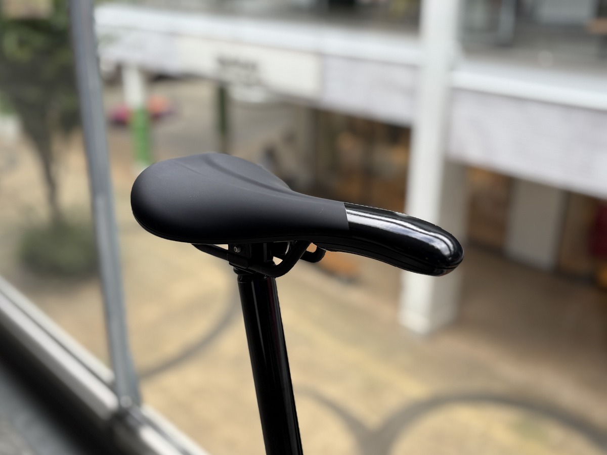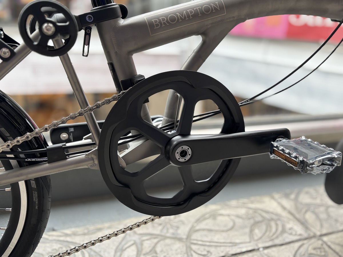 サドルはブロンプトンらしい形をしておりますが、スポーティーな形になっていてレール素材はカーボンとなっています。ノーズ裏は持ち上げたときに滑りづらい様にシリコン状素材が張り付けられており、持ち運びの事も考えたパーツ設計です。シートポストもカーボンですが、何度も上げ下げをするので強度的な面で表面をスチールアーマーで補強しております。