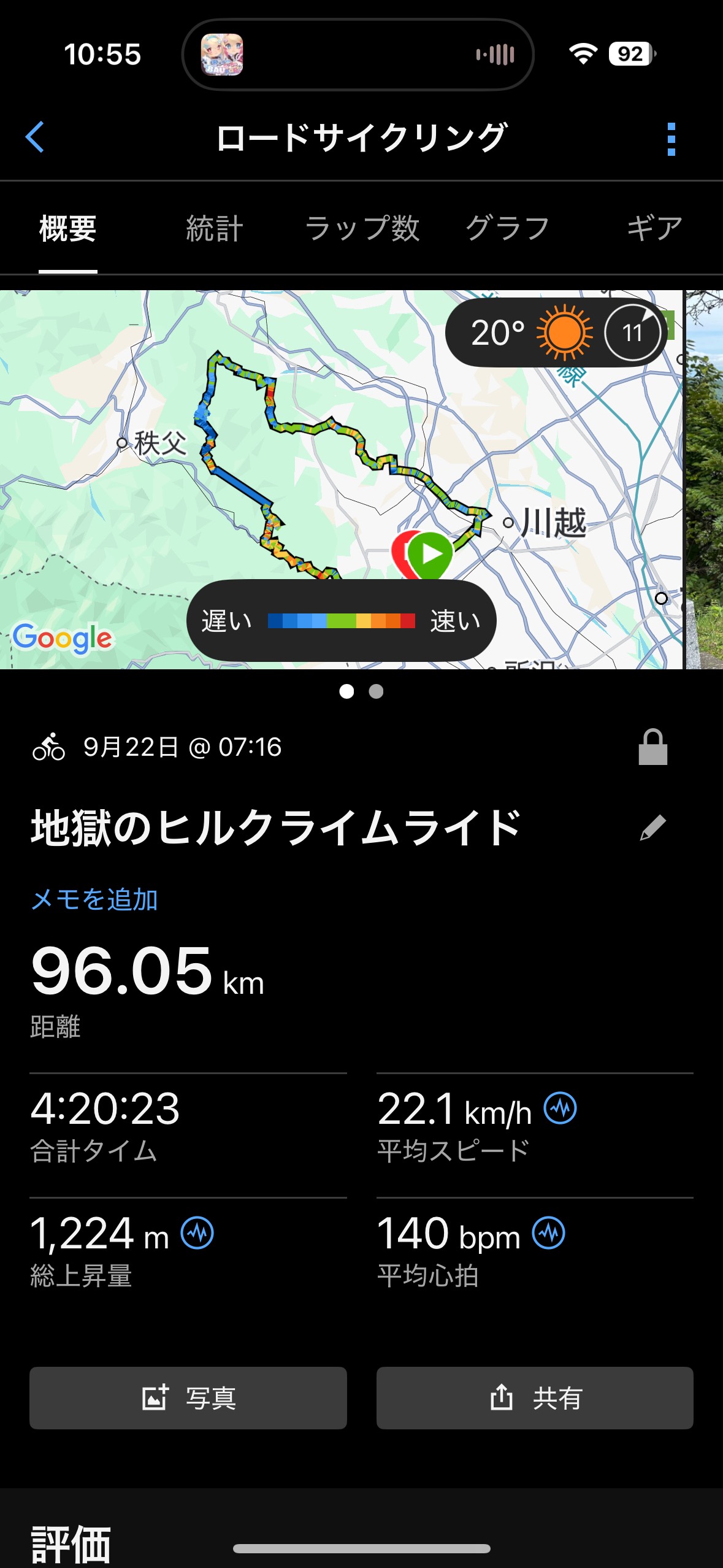 走行距離は96km、獲得標高は1224mとかなり登りました。