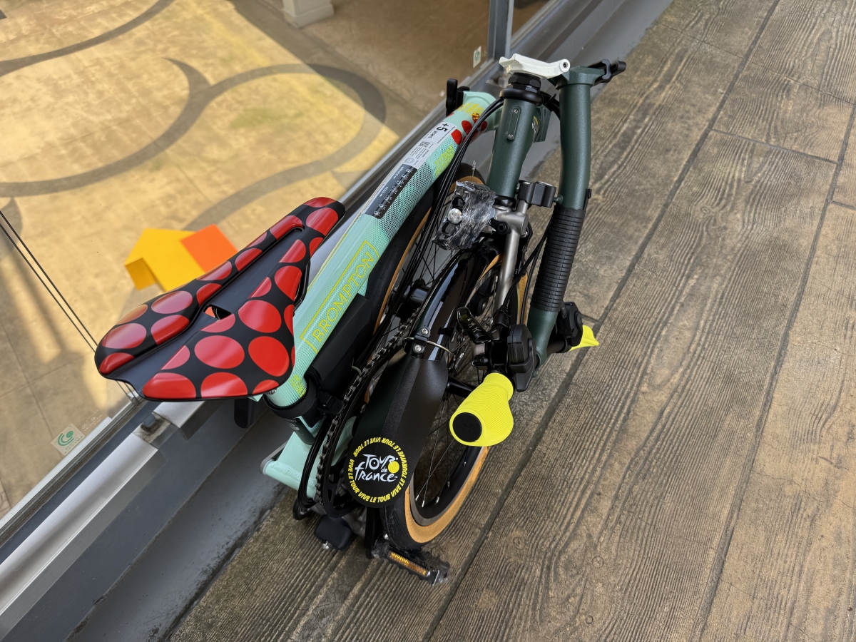 今年はツール・ド・フランス限定カラーのBROMPTONが登場しましたが、4賞ジャージオマージュの派手派手なP LINEは店頭在庫がございますので、現物を見て頂けます!