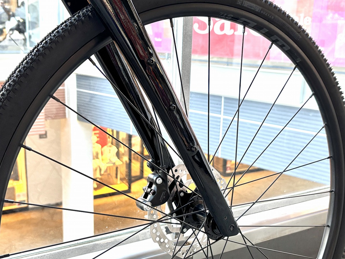 フォークはカーボンなので振動吸収性に優れる他、車重も軽くなるので加速性や登りでのアドバンテージがあります。