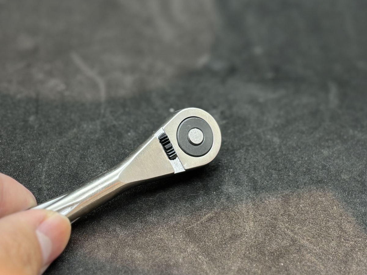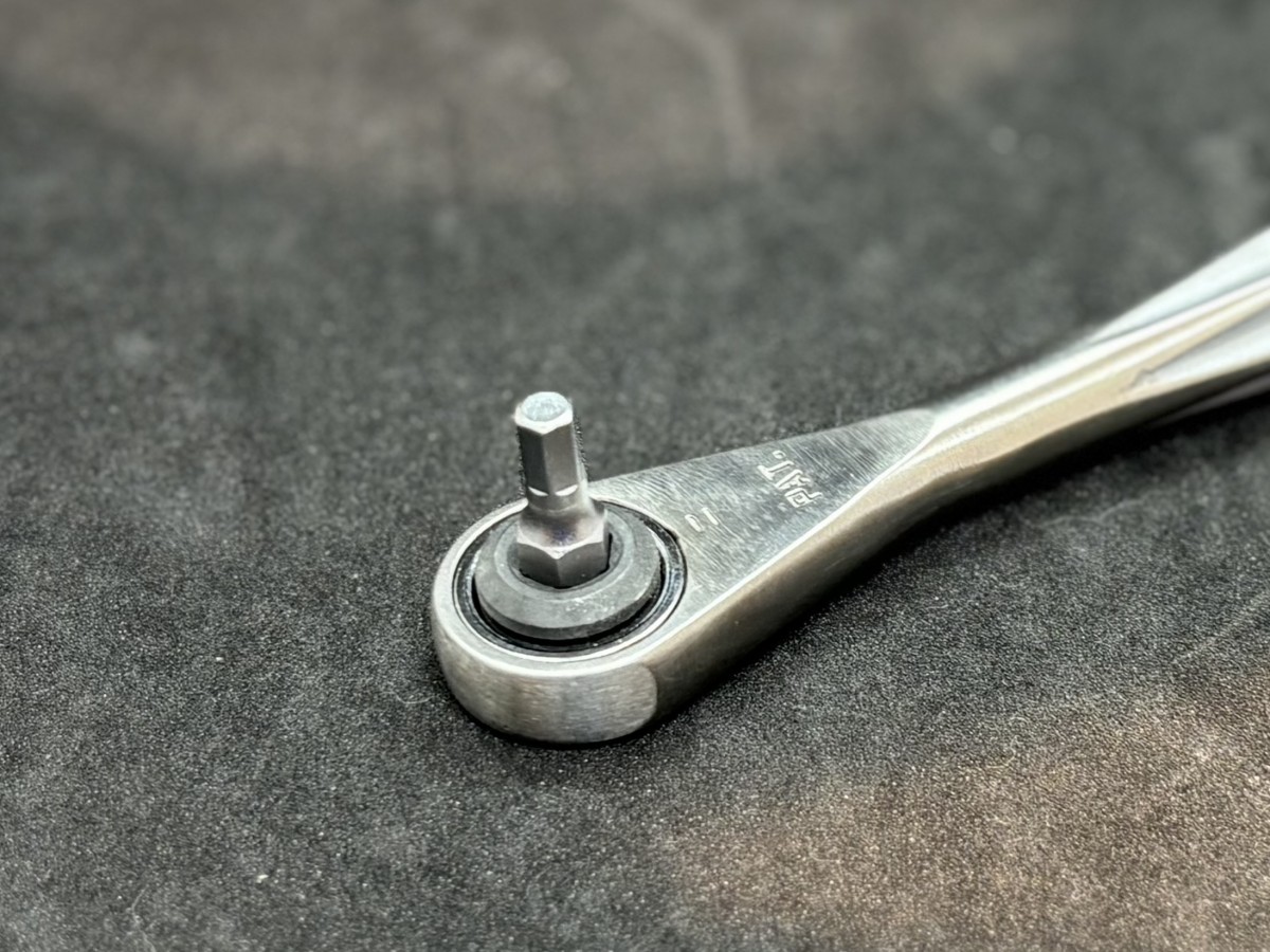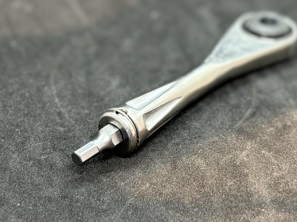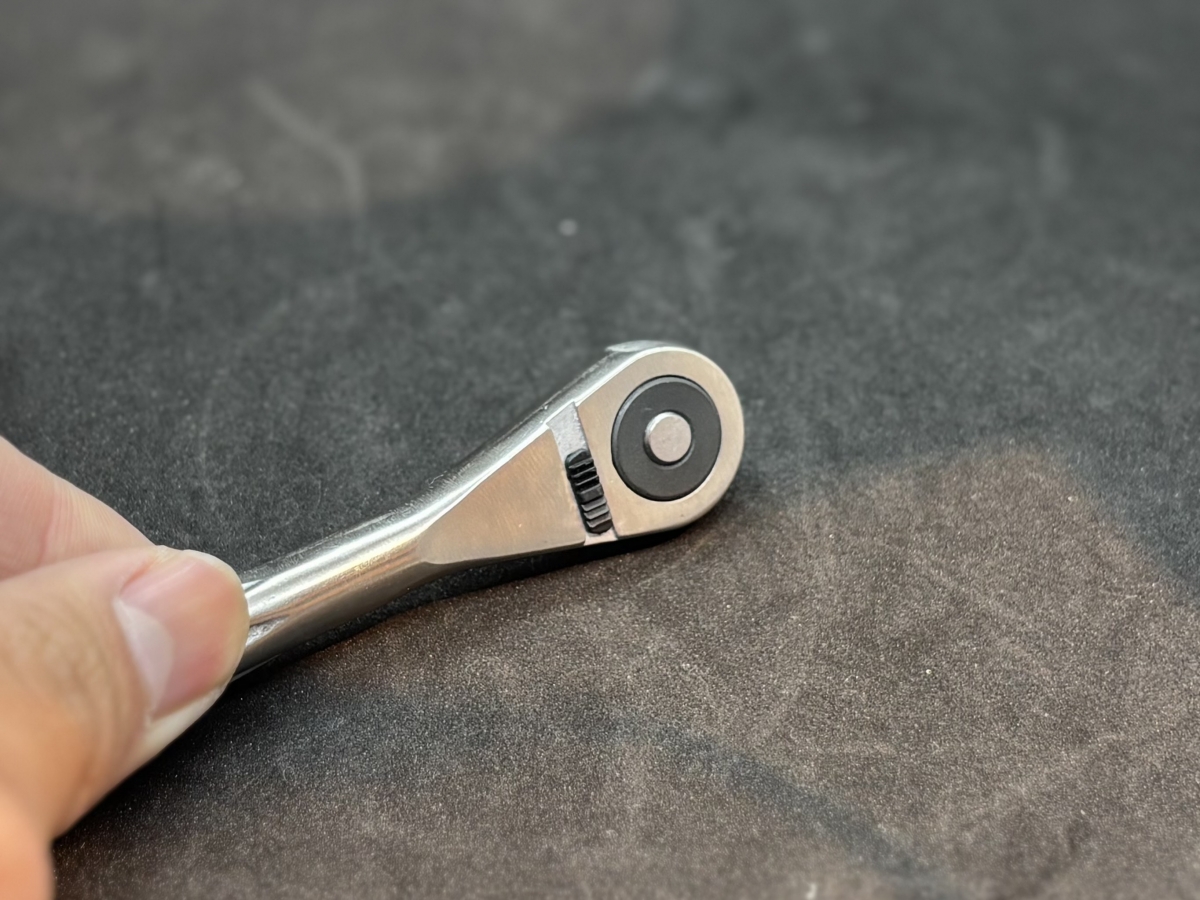 ラチェットハンドルなのでネジを締める、緩めるどちらも使え、折田の指と比較すると分かるかもですが、かなりサイズ感がコンパクトです。