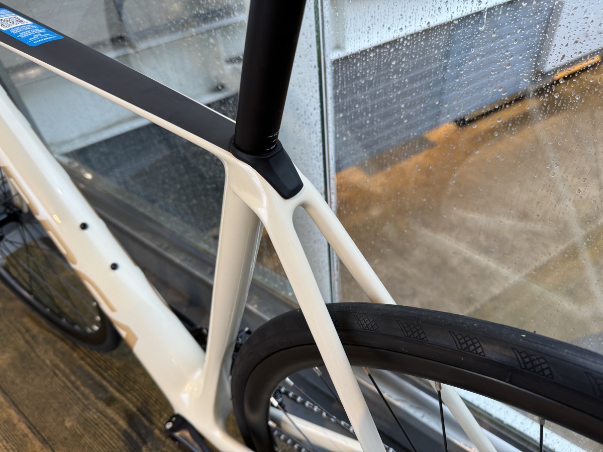 リアトライアングルは、昨今のエアロモデルとは異なり、シートチューブ上端からモノコックステーになっていますね。