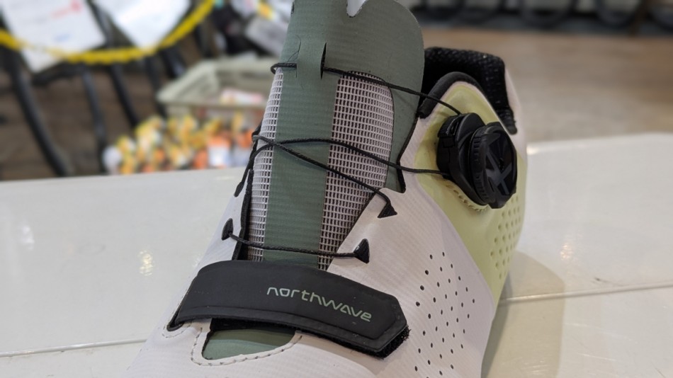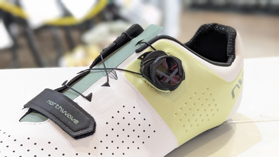 固定方法はベルクロとダイヤルのハイブリッド方式です。ダイヤルはノースウェーブ独自のSLW3ダイヤルを採用しています。ノッチ数が細かく足に合わせて調整が楽に行えます。またダイヤル上部にあるつまみは上に引っ張ることで開放され、下に押すことで0.7㎜ずつ緩めることが出来ます。