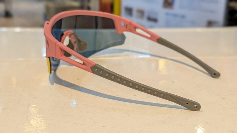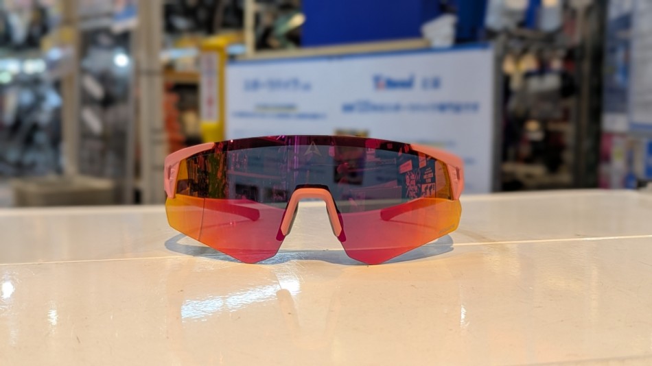 正面から見るとかなりスタイリッシュで角張ったデザインが採用されています!フレームレスに見えますが上部にハーフフレームモデルです。ただ、実際にかけてみた印象としてはフレームが視界に入って邪魔に感じることも無く程よいホールド感と軽さを感じられました!レンズは偏光レンズです。