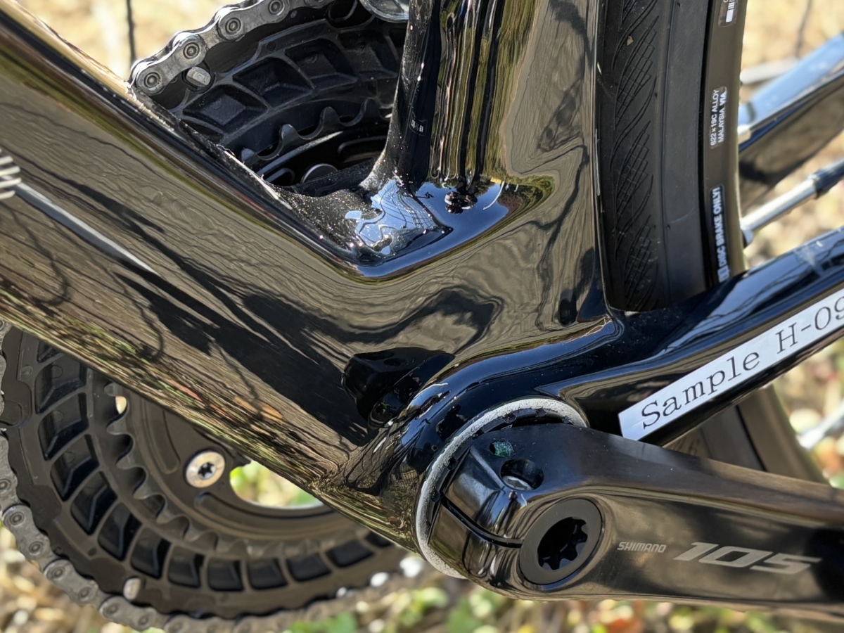 BB周りはかなりマッシブになっています、BB規格もT47と大径の物を採用しているのでトルクを掛けた時もパワーがロスする感覚がなく車体が即座に感覚がありました。