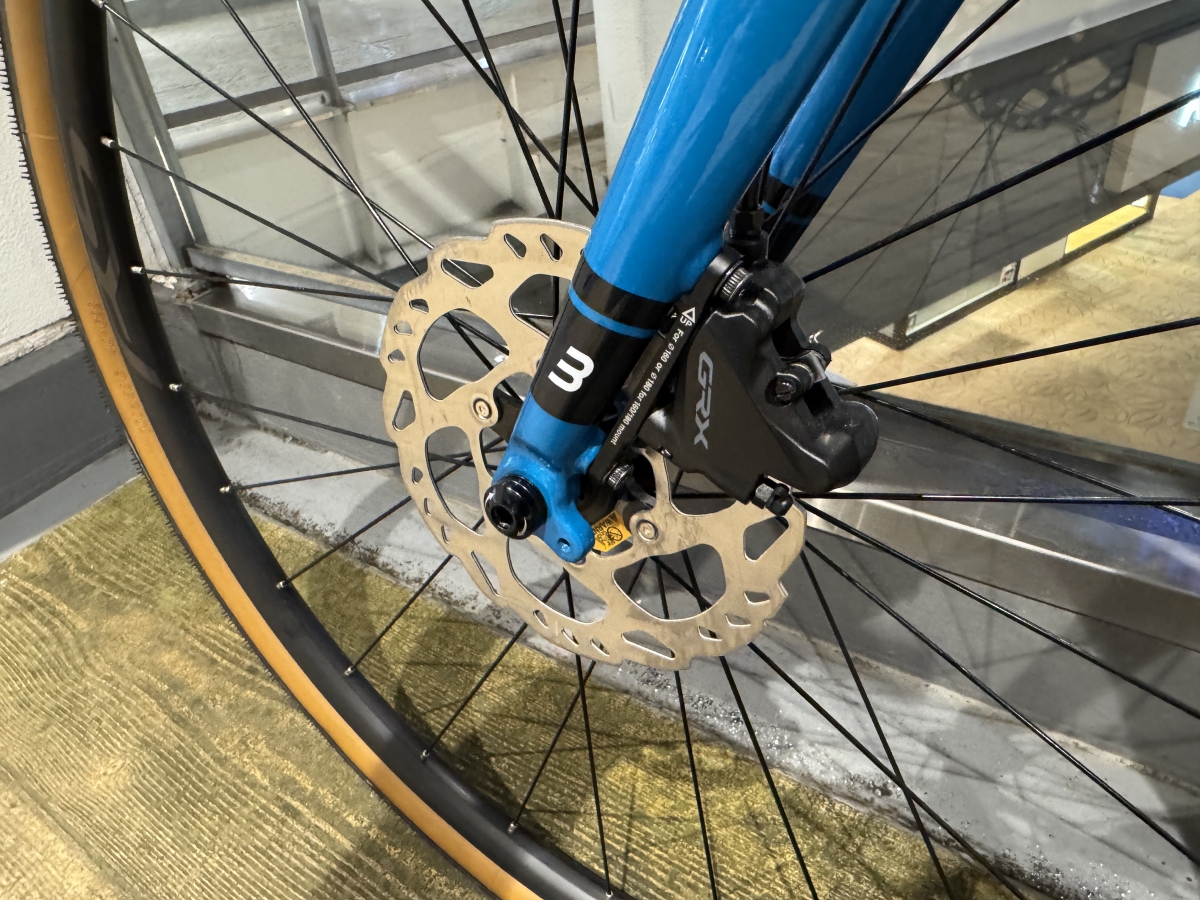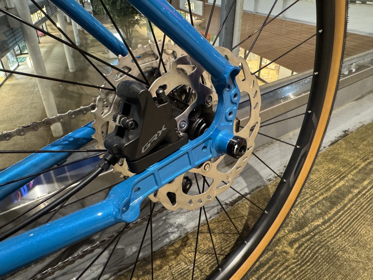 クロモリグラベルですが、フラットマウントの油圧ディスクブレーキを採用。