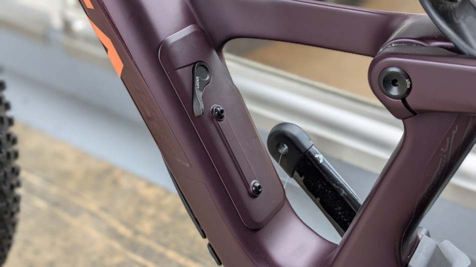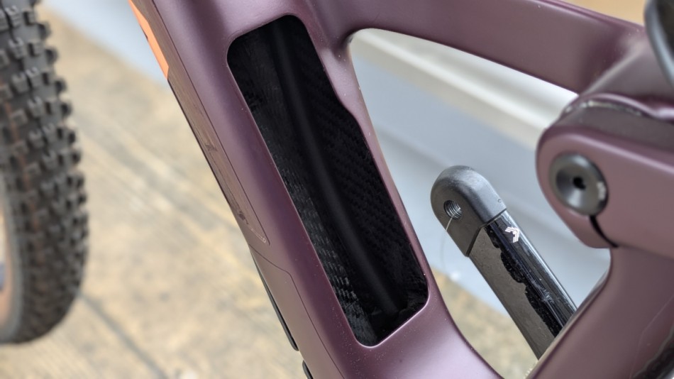 ダウンチューブにはストレージも設けられています。ボトルケージを付けたままでも取り外しができ、スペースもかなりあるのでパンク修理キットなどのほかに薄手のウィンドブレーカーなども収納できそうです。