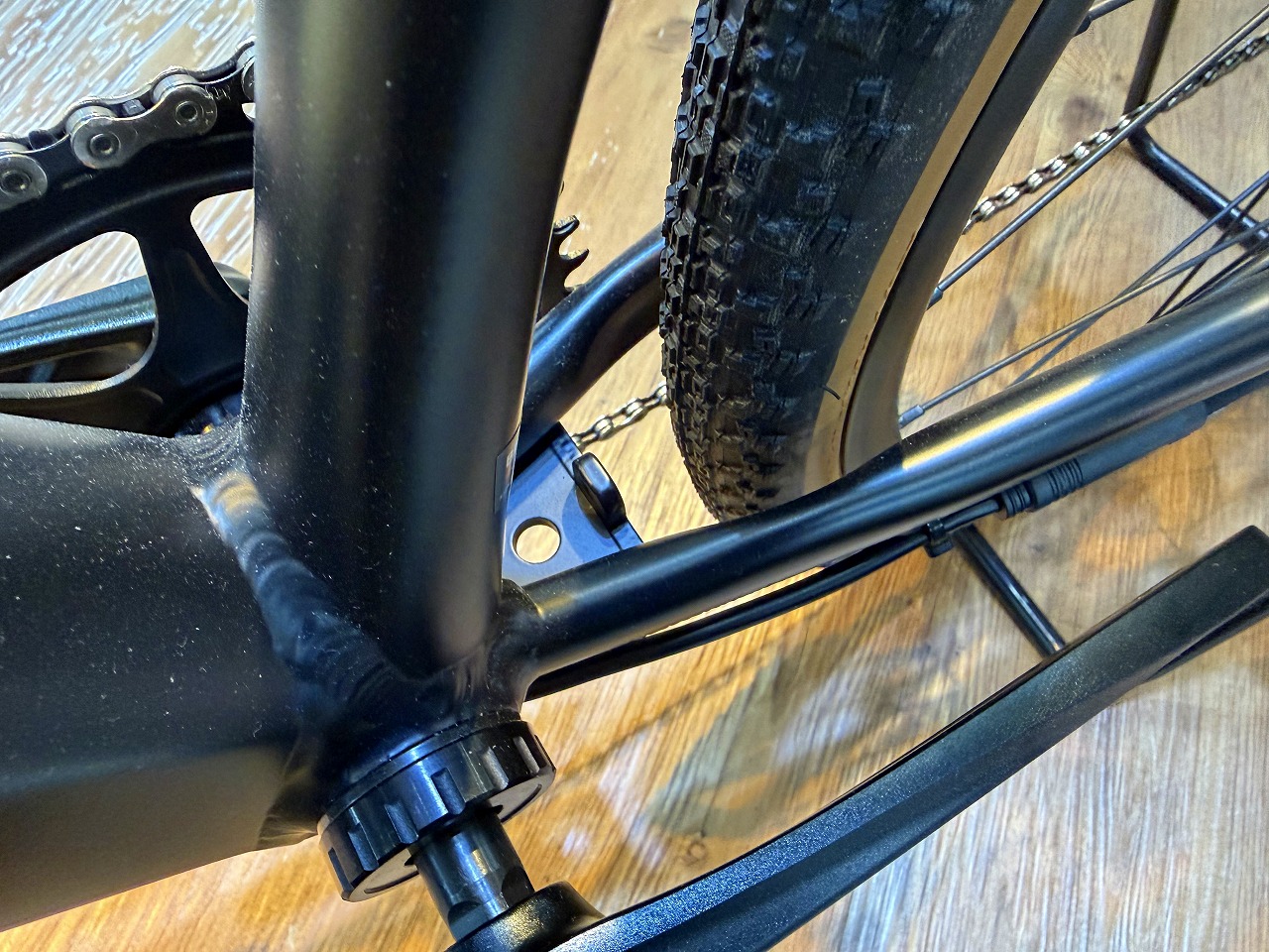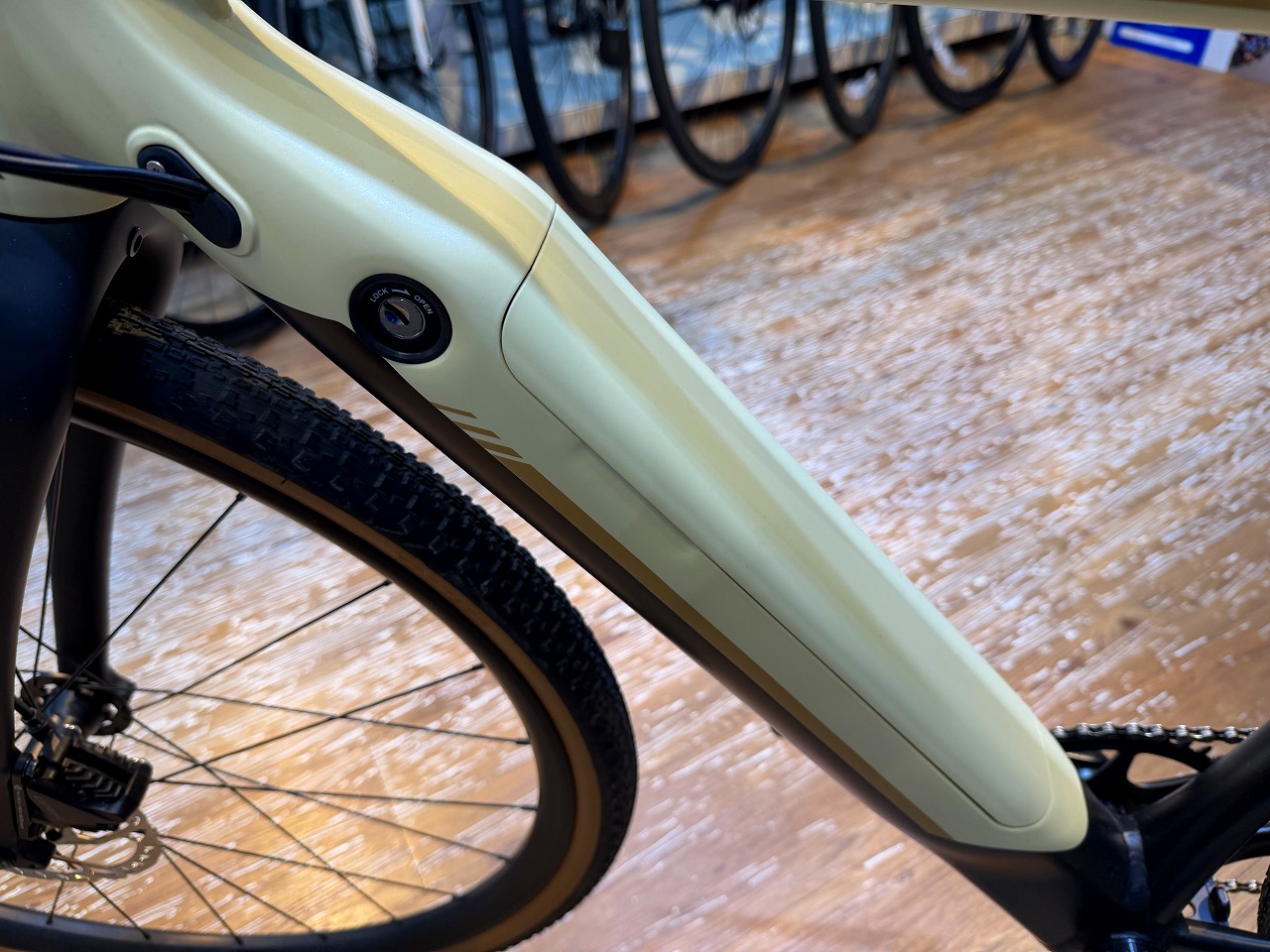 ダウンチューブに綺麗に収められたバッテリーは1.45kgと十分な軽さでサイズも小さく、予備を持ち歩くのも簡単そうですね。