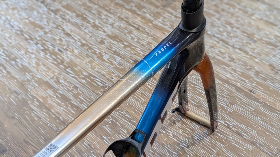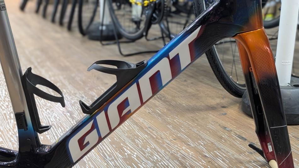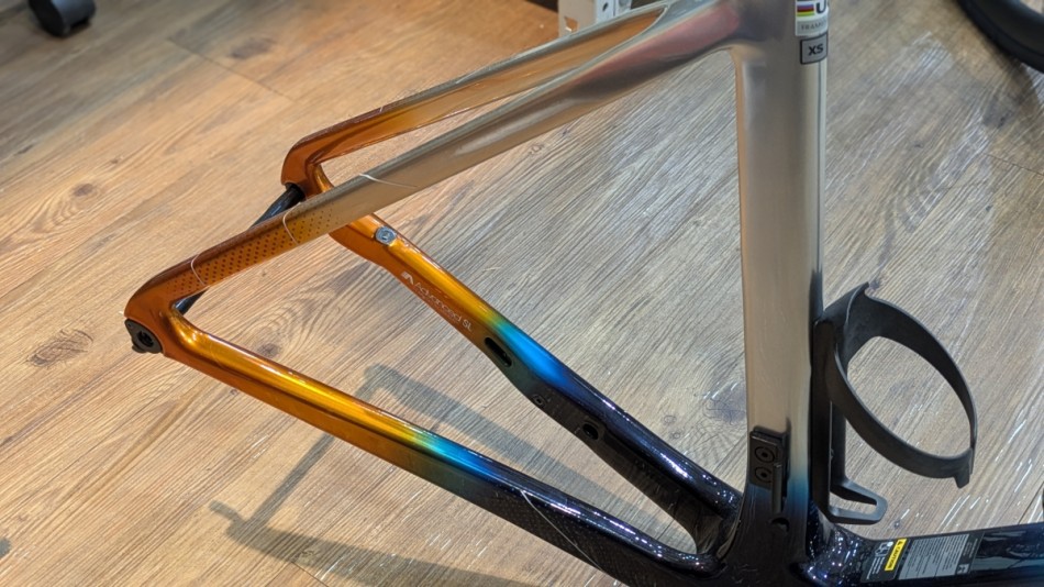 フレーム各所のグラデーションがとても綺麗です!このカラーはチームキットがお披露目になった時から一目ぼれするくらい気になっていたカラーでしたが、実物は写真で見るよりも数段綺麗なカラーリングでした!