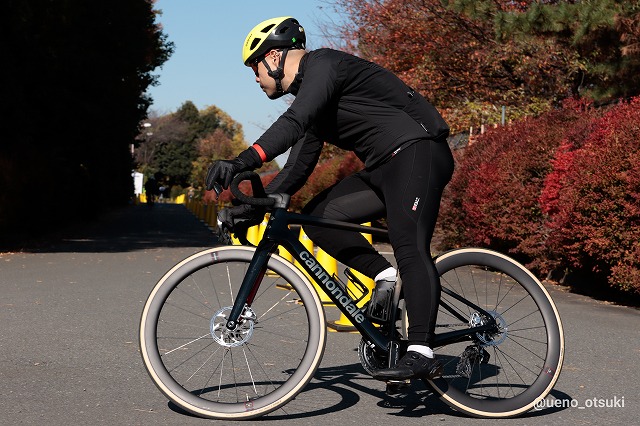 他メーカーと比べるとオールラウンドとしてはかなりマッシブなフレーム形状は高速巡行域への到達、維持が非常に速いです。軽量なフレームな為バイクも振りやすく、これは登りでもアドバンテージを取りやすそうです。