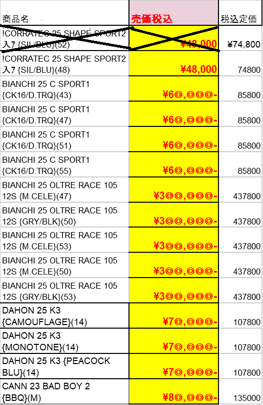 表に✕印がある車体は完売となっているのであらかじめご了承ください。