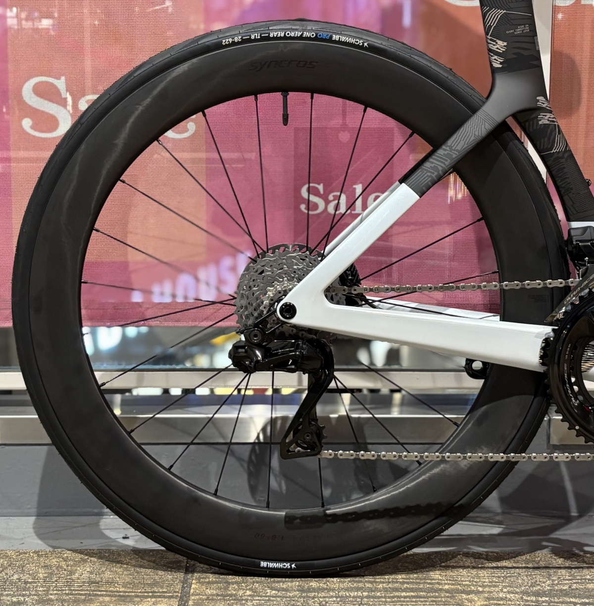 タイヤにはSCHWALBE PRO ONE AERO 700×28Cをアッセンブル、TLRタイヤですが、クリンチャーでアッセンブルされているのでTLR化したい場合はご相談ください!