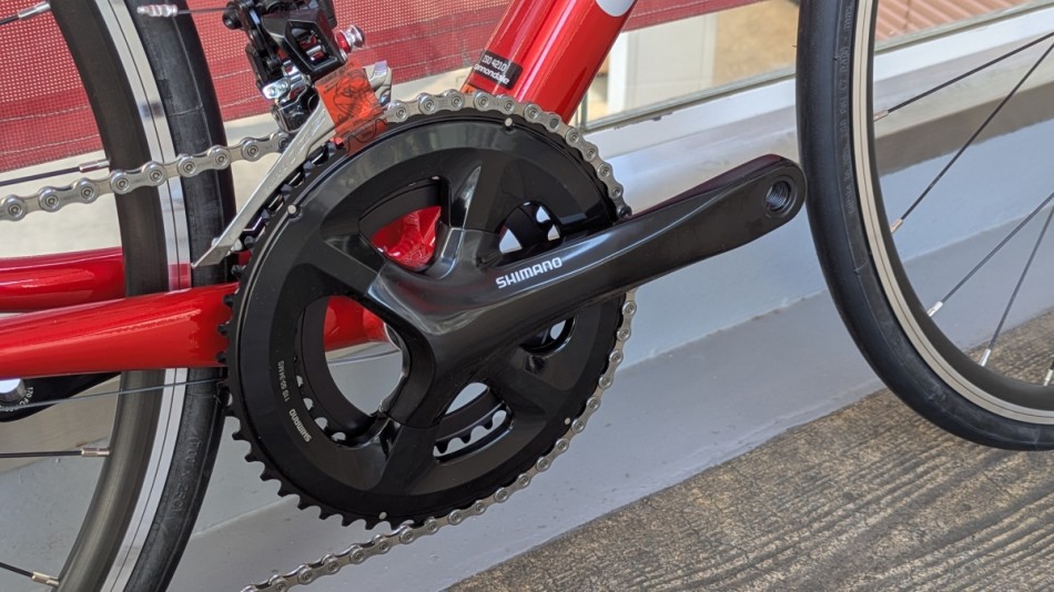 クランクはノーグレードの物を採用しています。重量や剛性感は105のクランクと比較すると多少劣る部分はありますがサイクリングなどでは問題なく使用することができます!