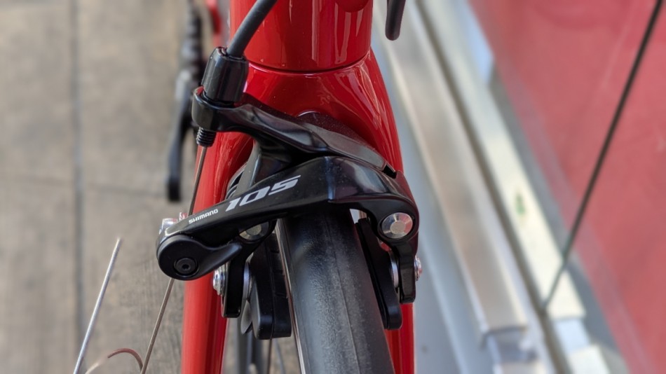 ブレーキに関しては105純正のブレーキを搭載!105のブレーキキャリパーは剛性がしっかりありブレーキング時のたわみが少ない分しっかりと効いてくれます。リムブレーキはグレード間での差がかなり顕著に出るため105純正が標準装備なのはかなり安心です!