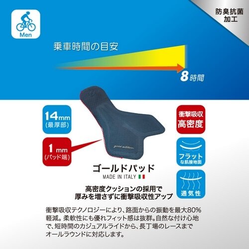 パッドにはゴールドパッドを採用!しっかりとした厚みのあるパッドでかなりの衝撃吸収性があるので長距離のライドにも十分対応してくれます!
